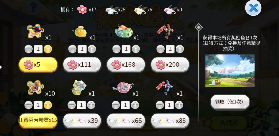 用收集到的小花和蓝、黄、粉芬芳精灵,可以兑换新鱼。获得所有奖励鱼,可以领取活动背景。