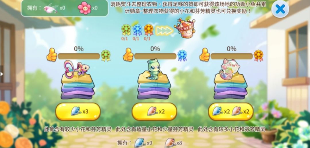 消耗熨斗去整理衣物,获得足够的赞即可获得该场地的功勋小鱼并累计勋章~