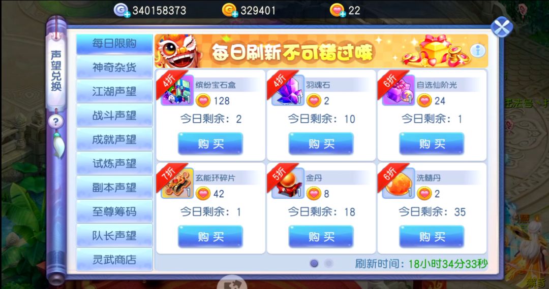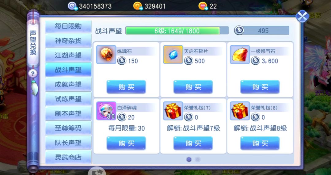 试炼肯定是前期优先把所有的伙伴培养到五星并且突破全满,然后就靠每天的积攒声望积分,定期查看是否刷新出价格合适的高级兽诀,兑换高级兽诀就成为了我们重要的经济来源之一。