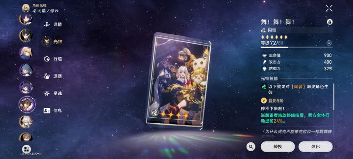 没想到这个拉全队行动的能力这么强,直接给我多腾出两回合,没有舞舞舞这个光锥,还差两个回合才能打死对面。真的是比什么加伤光锥好用多了