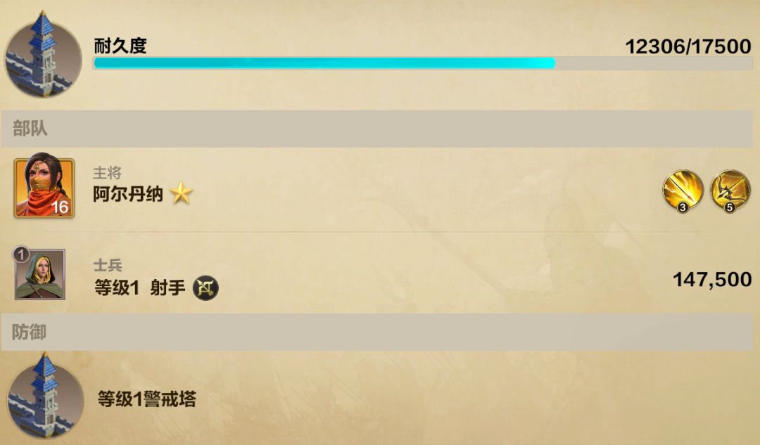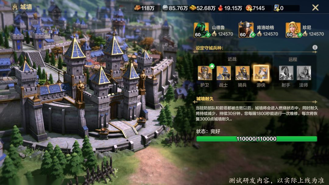 除了建筑以外,领主大人还可以派遣城防部队共同参与守城:点击城墙,即可派遣最多三名英雄共同参与守城,因为只能设置唯一的守城兵种,因此这里建议大家派遣自己最强力的部队参与守城。