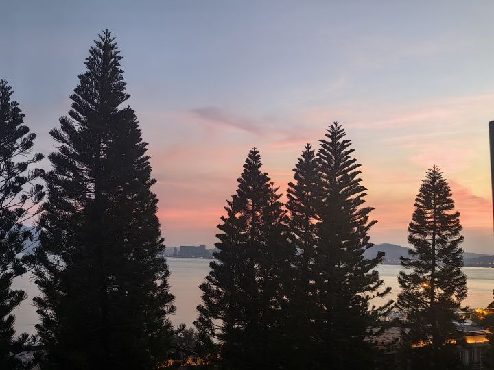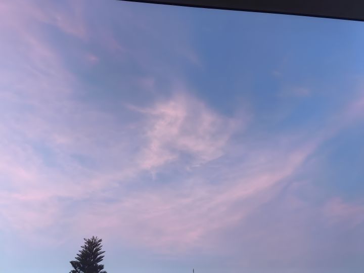 肉眼看粉色更深,蓝色更浅,不会调手机相机参数,只能随手照了。过了一会儿天色就变暗了,云彩也散了。