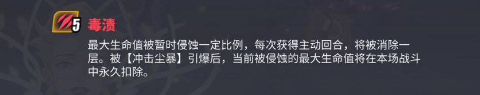 毒渍:最大生命值被暂时侵蚀一定比例,每次获得主动回合,将被消除一层。