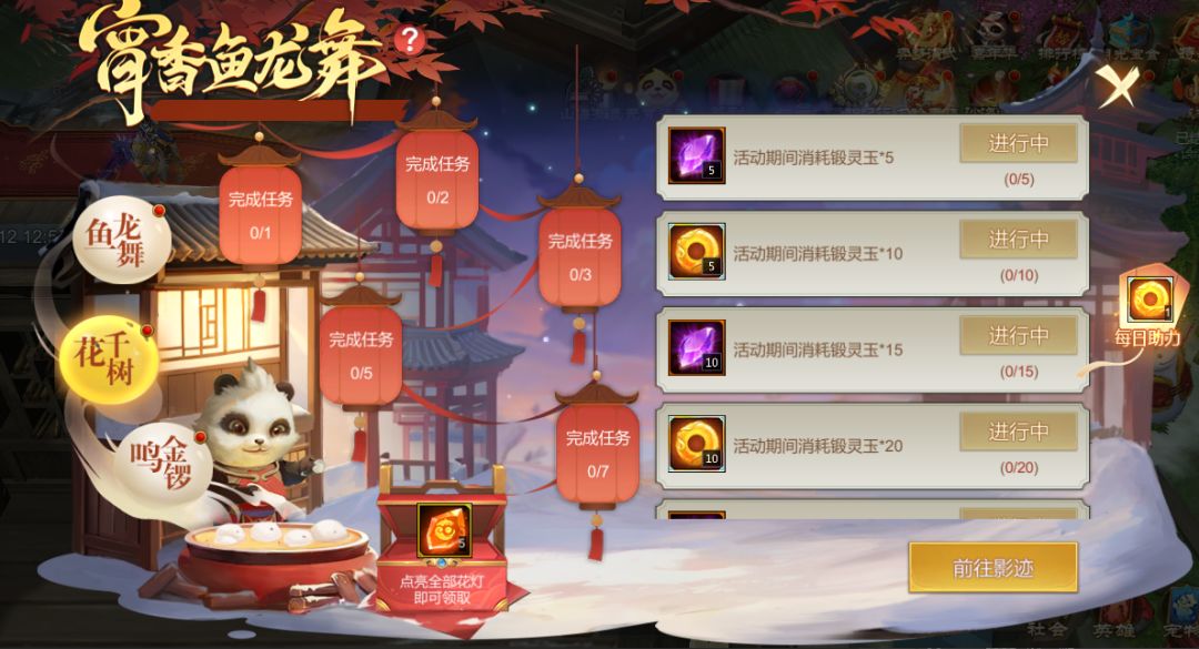 完成对应数额的任务后,仙术师们可以点亮花灯,点亮全部花灯即可领取影迹残痕*5。