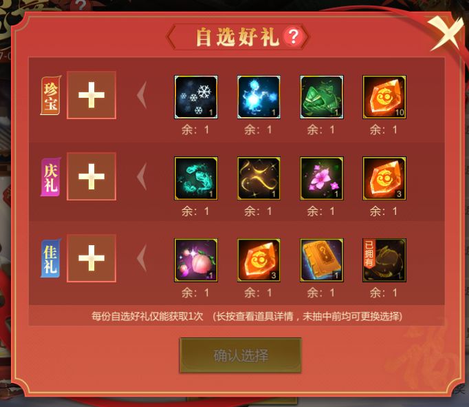 1、活动期间每位玩家可自选珍宝、佳礼和庆礼各1份物品加入奖池自选好礼共3份。