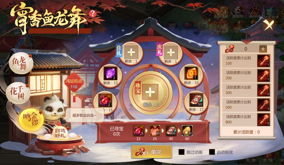 在鸣金锣中,大家可以通过累计活跃度或商城购买获得五福槌,随后消耗五福槌进行抽奖,每次抽奖消耗1个五福槌。在本次的奖池中,各位仙术师还能自选三份好礼。