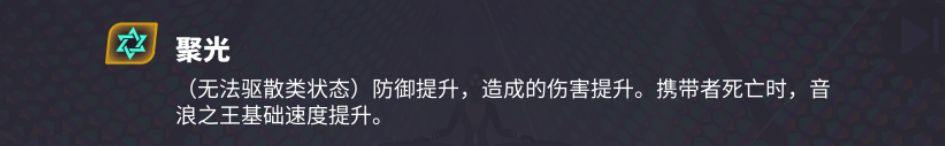 我方减益:(无法驱散类状态)防御提升,造成的伤害提升。携带者死亡时,音浪之王基础速度提升。