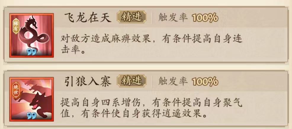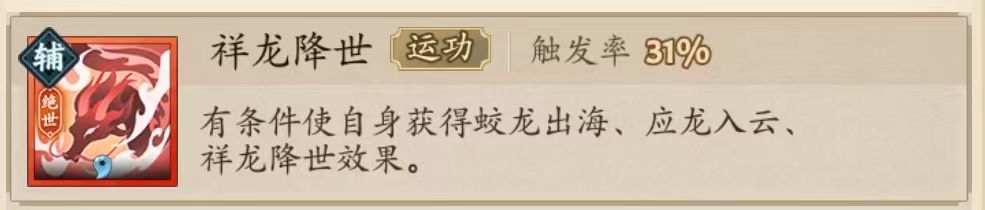 2.祥龙降世。回合数决定了运功触发效率,所以聚气条拉得快最直观感受就是运功收益更高了(内功中的dot覆盖效率更高了),实战了几天新年招式在高速体系中的运转非常优秀,增加了越战和爆冷的几率,提高上限。