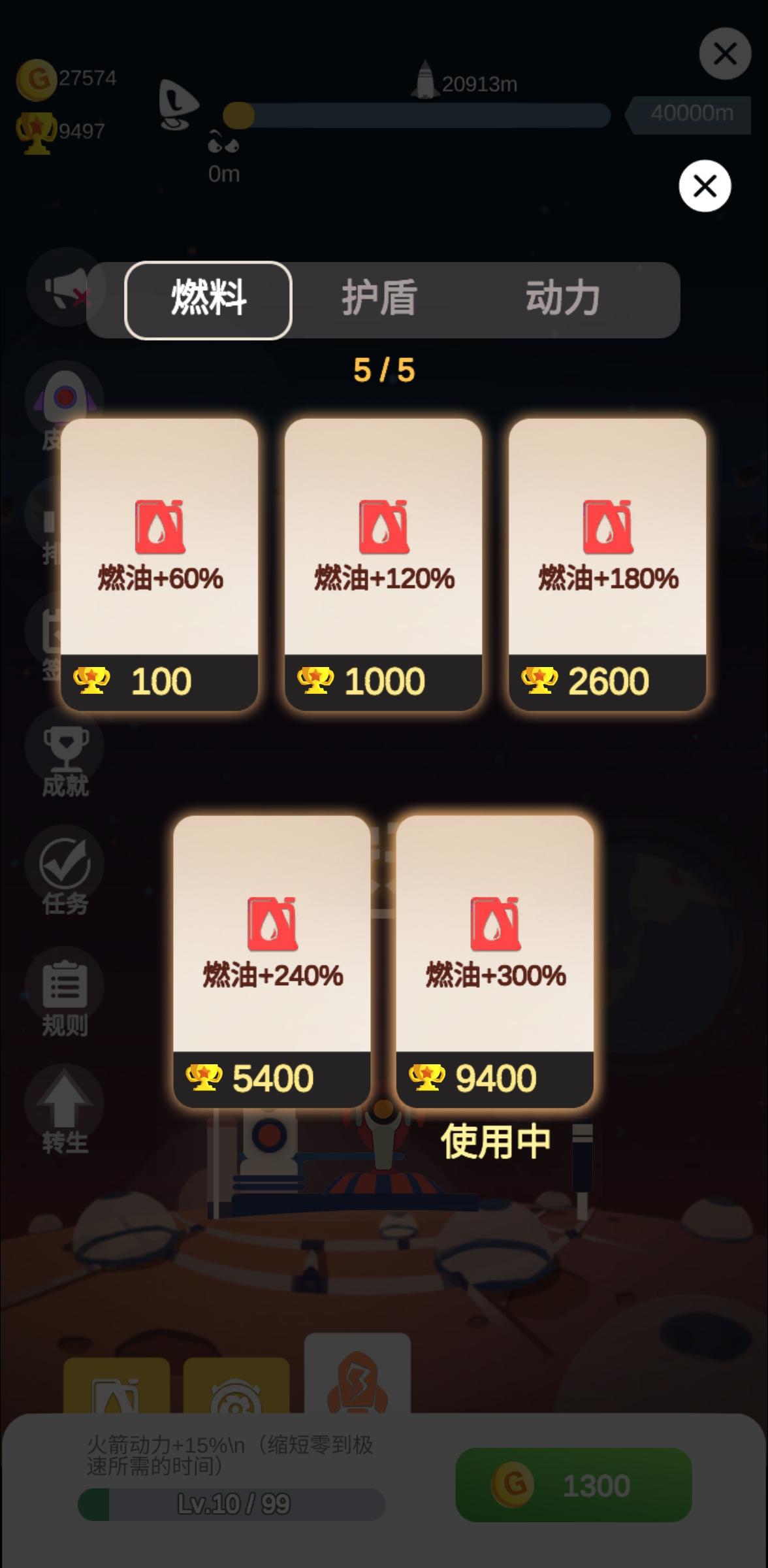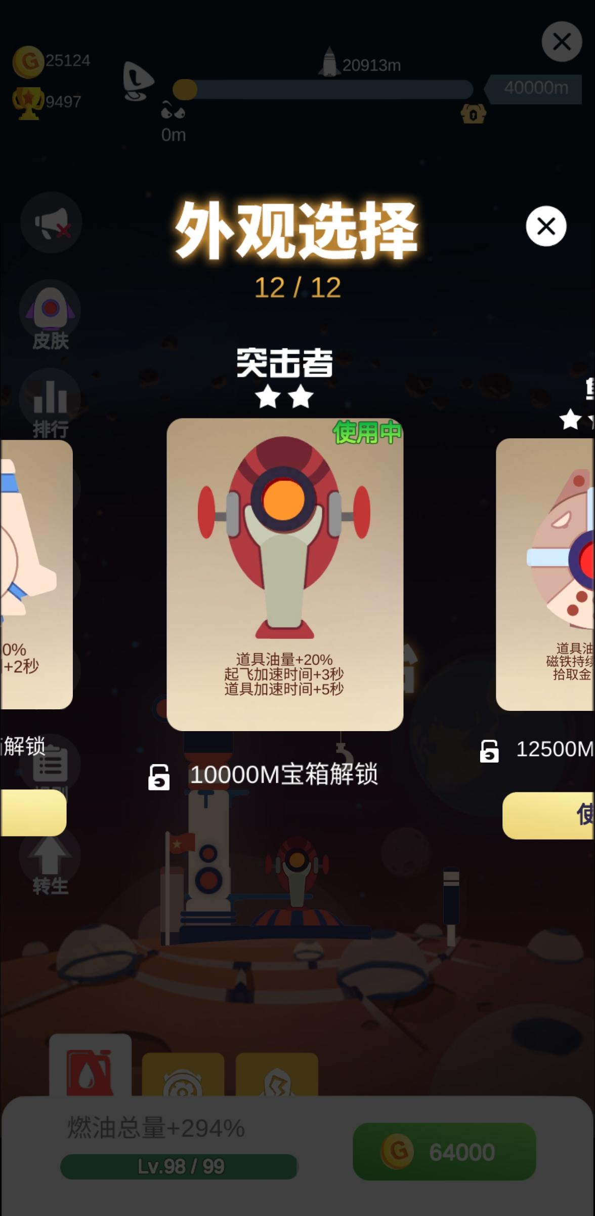 剩下的就是反复玩小游戏攒钱加点,只要你5转+300%燃油、把燃油总量+到99级、选突击者皮肤,20000M就能到达