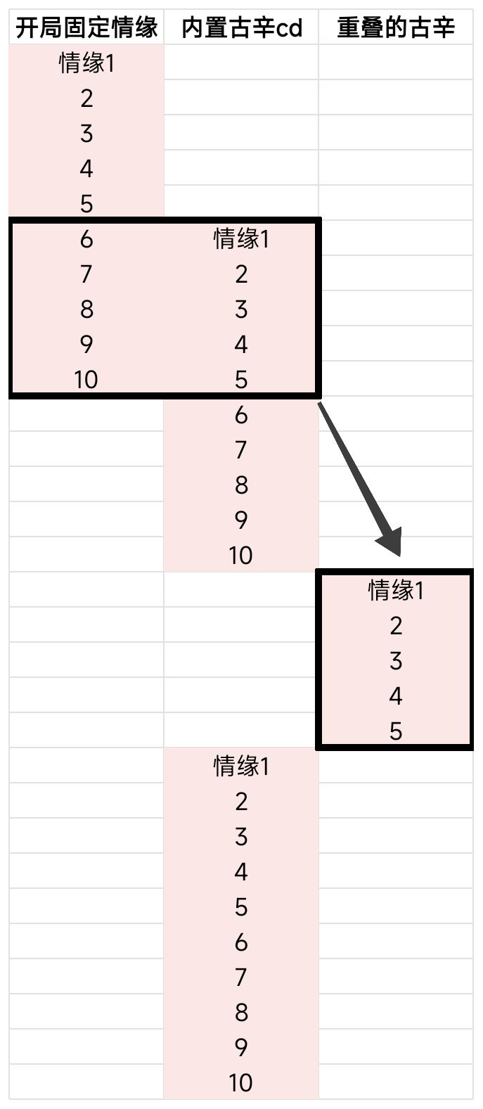 由于“情缘古辛”的层数可以叠加,每秒消耗1层。所以“重叠部分”(见黑框)的那5秒,就可以往后去放,相当于把持续时间延长了。