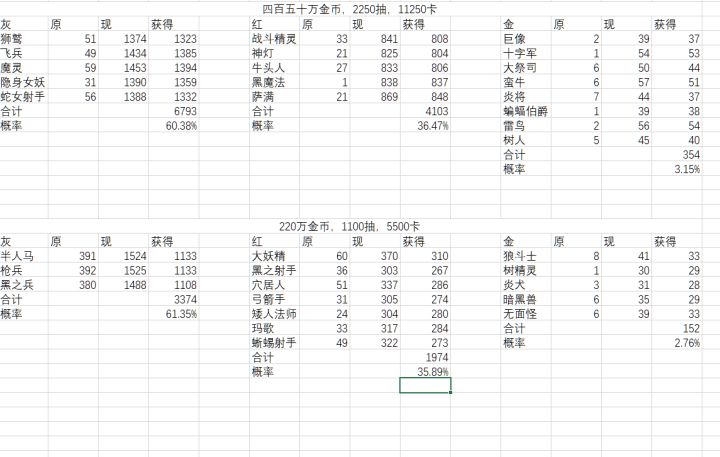 220万金币,1100抽,5500张卡,抽低领导力部队,实测出金概率2.76%