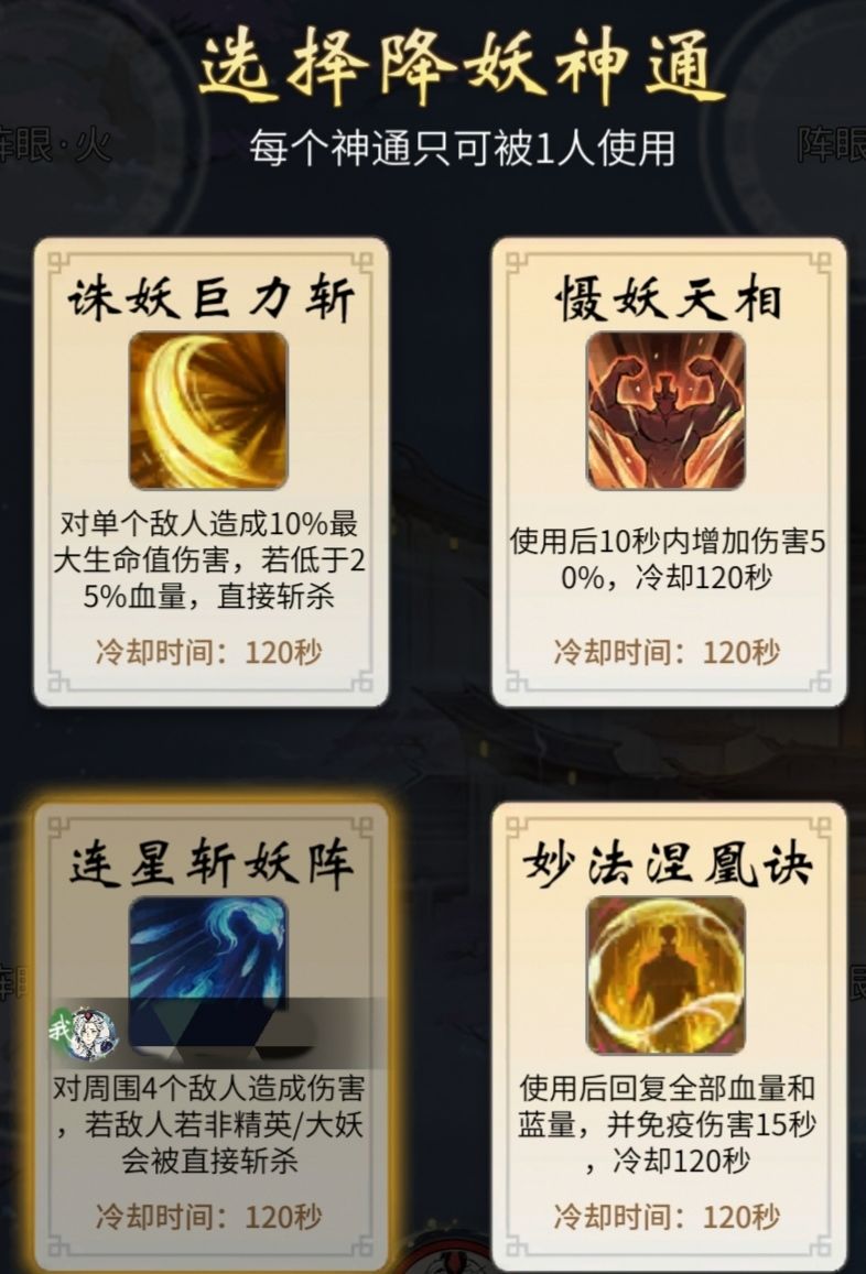 ③连星斩妖阵:万妖宝境中最具有操作手法的特色神通,可以直接秒杀四个小怪,但是对精英怪和BOSS毫无作用(它的“造成伤害”指一滴血的伤害,事实上只有斩杀小怪有效),这个神通会在散怪房间有奇效。下文细讲。