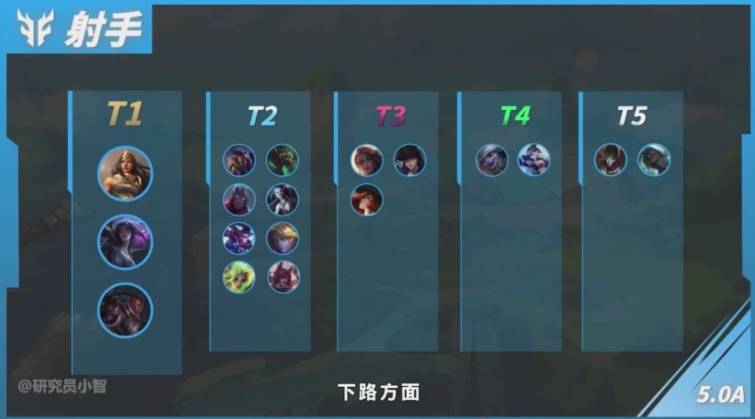 卡莎凭借着极高的可操作性和完善的技能升级机制,深受召唤师喜爱,持续霸榜T1。而另外一位射手图奇惨遭削弱,基础属性和R(4)技能的额外获利数值都有下调,这让他在前中期团战中失去了存在感,排名有所降低。