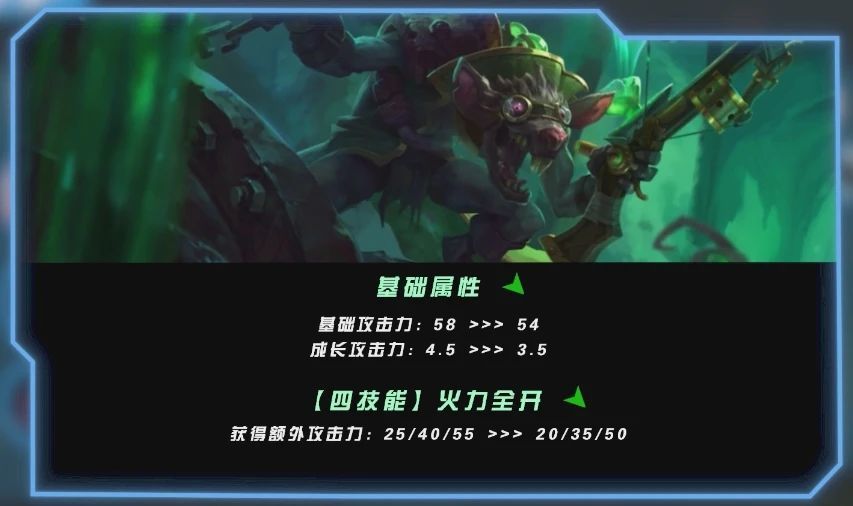 吉格斯在这一版本遭遇改动,被动技能对防御塔的伤害和Q(1)技能的伤害和冷却均有增强,排名随之上升。