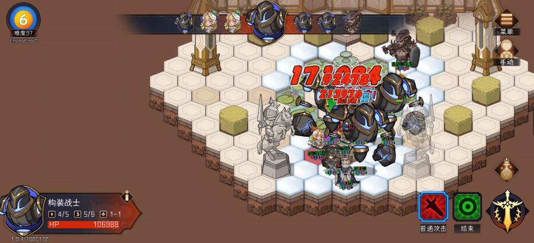 难97,如图可以看到三个伤害,17.1W,这是暴击时的伤害,9.2W,未暴击的伤害,21.4W,这是血神附伤,这把的暴击率忘记点开看了,最终实际暴击率约为60-70%,我们这里就按只有50%算,两次攻击一次暴击,每回合两次行动机会(萌新注意看技能描述),每次5个行动点,也就是攻击十次,每次伤害次数为3(基础为2词条+1),30次伤害一半暴击一半不暴击,约为400W,血神附伤则是不吃攻击次数为10次214W,至于攻击时概率附魔会加攻击次数,两个复制体也能提供本体相当比例的伤害,这些东西我们先全部忽略,每回合也有600+W的伤害,这BOSS总共3000W血我是在第七回合开始时打死(注意高达第二回合才能召唤出来),现在你可以理解为什当初细胞要把100层的血量弄到上亿了,因为25回合确实能打死。