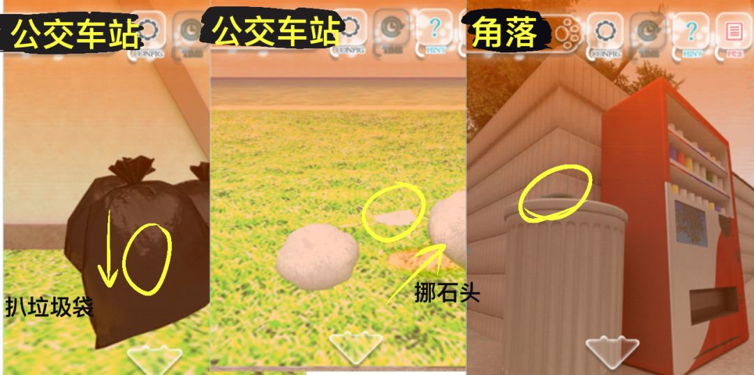 (公交站左边垃圾、垃圾袋旁石头、角落大垃圾桶上面)