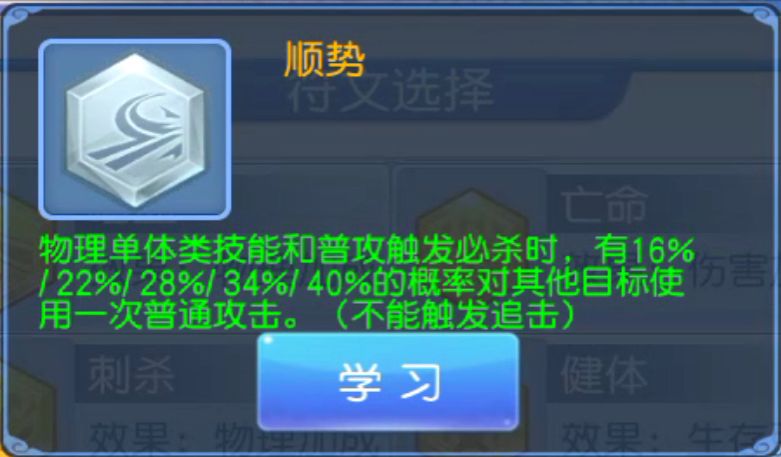 相比于第一个的连环,其实顺势也非常的强力,首先必杀这个技能肯定是每一个物理宝宝都必备的一个技能,一级是16%五级是40%的概率,这个概率比连环还高,任务带上,他真的是特别的强力!比武偶尔也会带来意外之喜,比如说收割有一个残血单位,但是还是那句话,随机不可控!