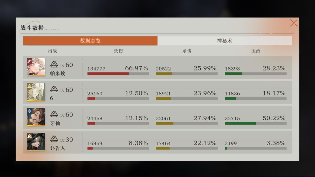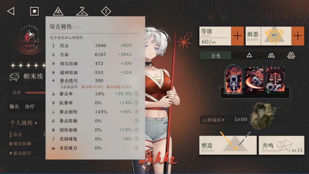 练度:3塑,共鸣11,洞悉III60级。攻击1849,暴击33%,爆伤161%,创伤加成15%,法术威力0%