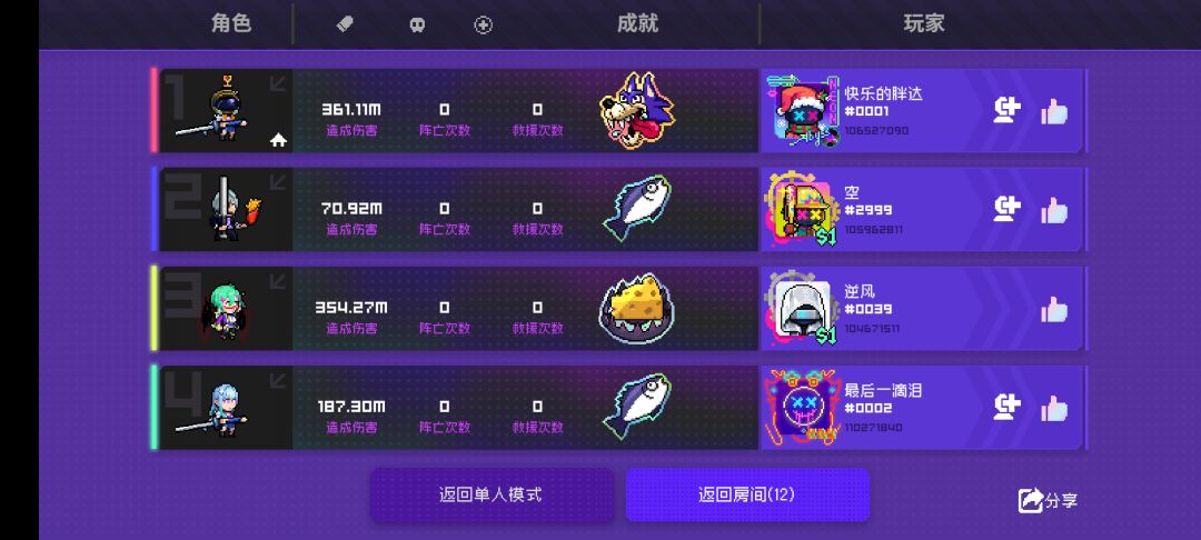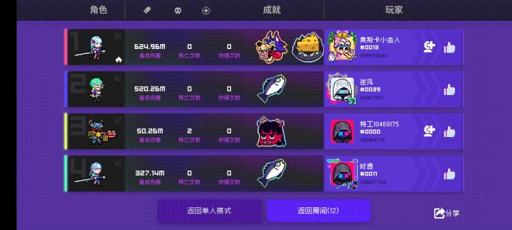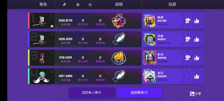 接下来到第十回合内都是差不多的,琳一直买显卡到20级,琳优先购买加移速和武器伤害的纪念品,有电也可以买电,只要保证伤害足够,速度越快越好,可以及时支援全局,刀哥们随便买些超维和近战就行,第十关基本上boos也是被刀二秒杀的份,这里需要琳把分身放在刷怪门附近防止偷家,不放也无所谓。