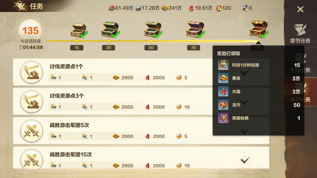 ①每日任务:尽量全部完成,至少开启全部活跃度宝箱,有龙币和英雄秘典奖励。