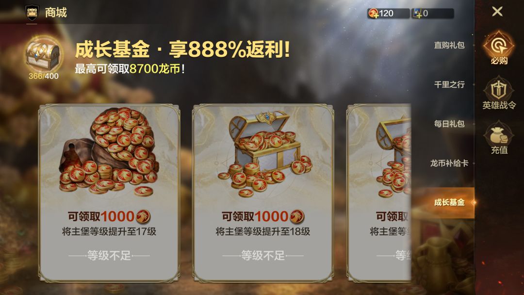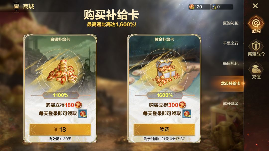 白银补给卡1100%返还龙币,黄金补给卡1600%返还龙币,可以同时购买,性价比超高,长期玩必不可少。