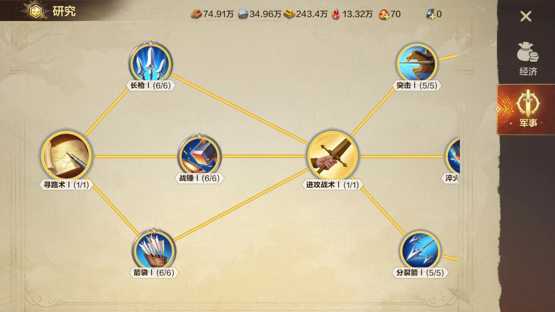 ①经济科技:建议优先研究,提升资源产出效率,只要英雄征程进度没有受到明显阻碍,都优先升级。