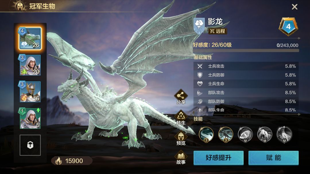 ②冠军生物主要包括好感度提升和赋能两种,前者提升士兵属性,后者提升部队属性,还会解锁新技能,特别是技能对于队伍提升非常大。