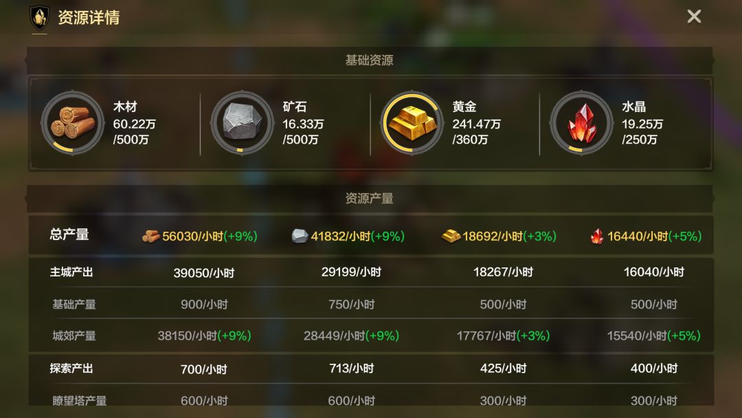 基础资源:包括木材、矿石、黄金、水晶四种,分别用于建筑、训练士兵和研究科技