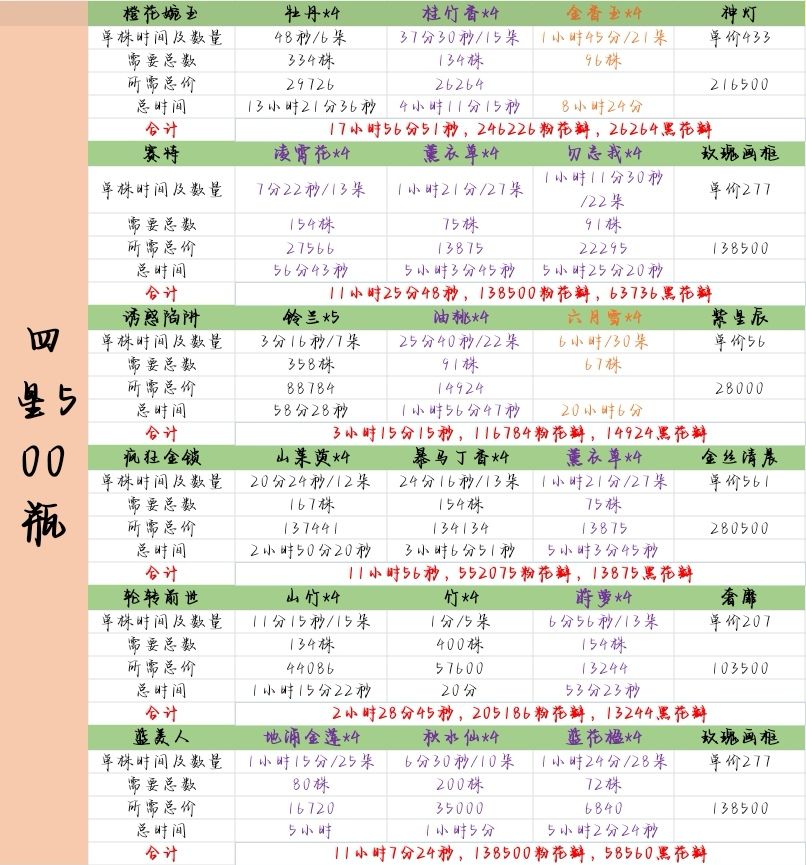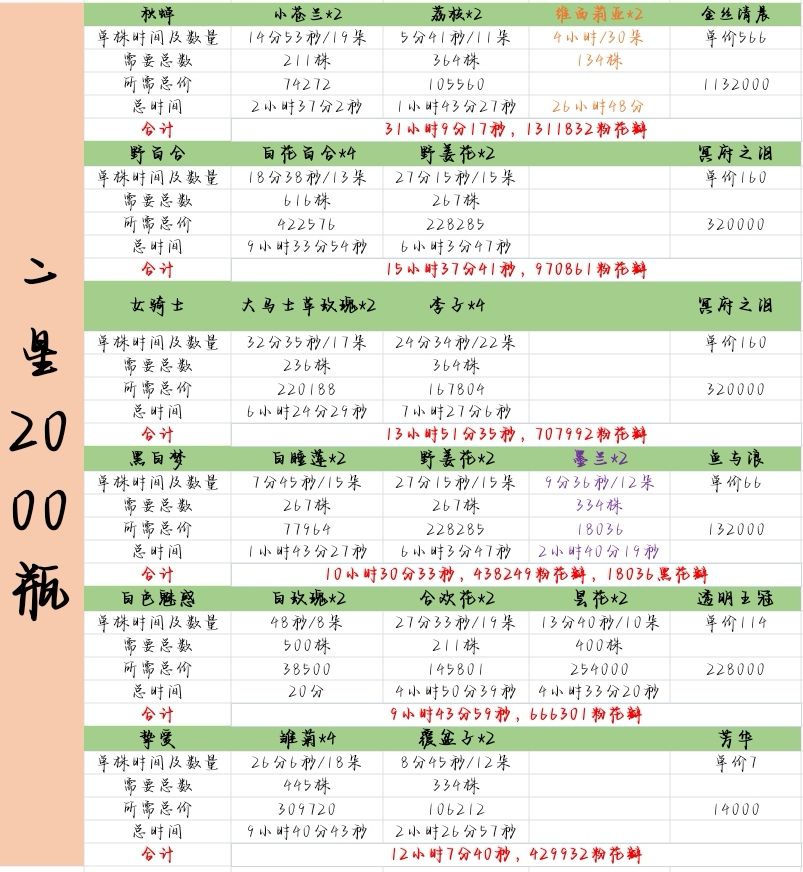 1、单株所需时间及数量是假设无土地加成的数据,也就是一级都没有升级的情况下的。