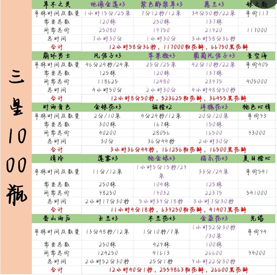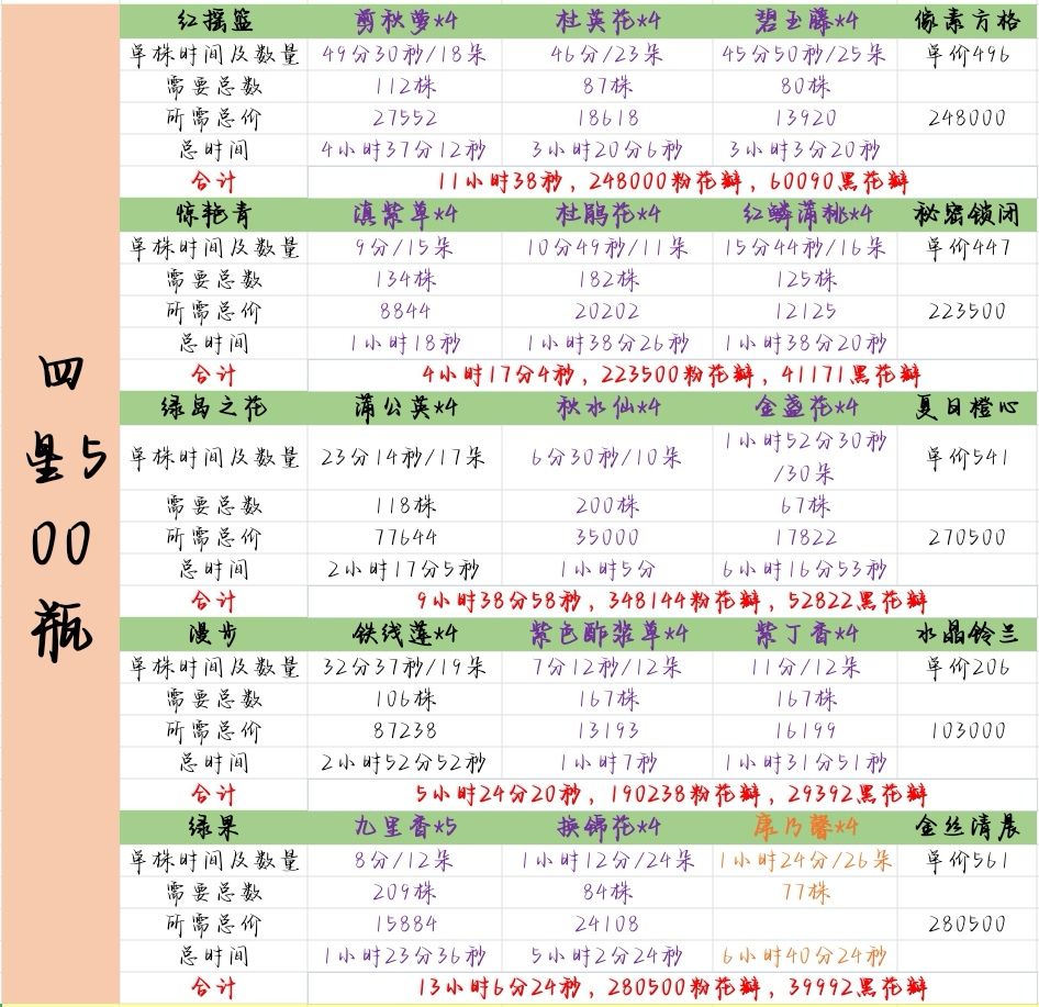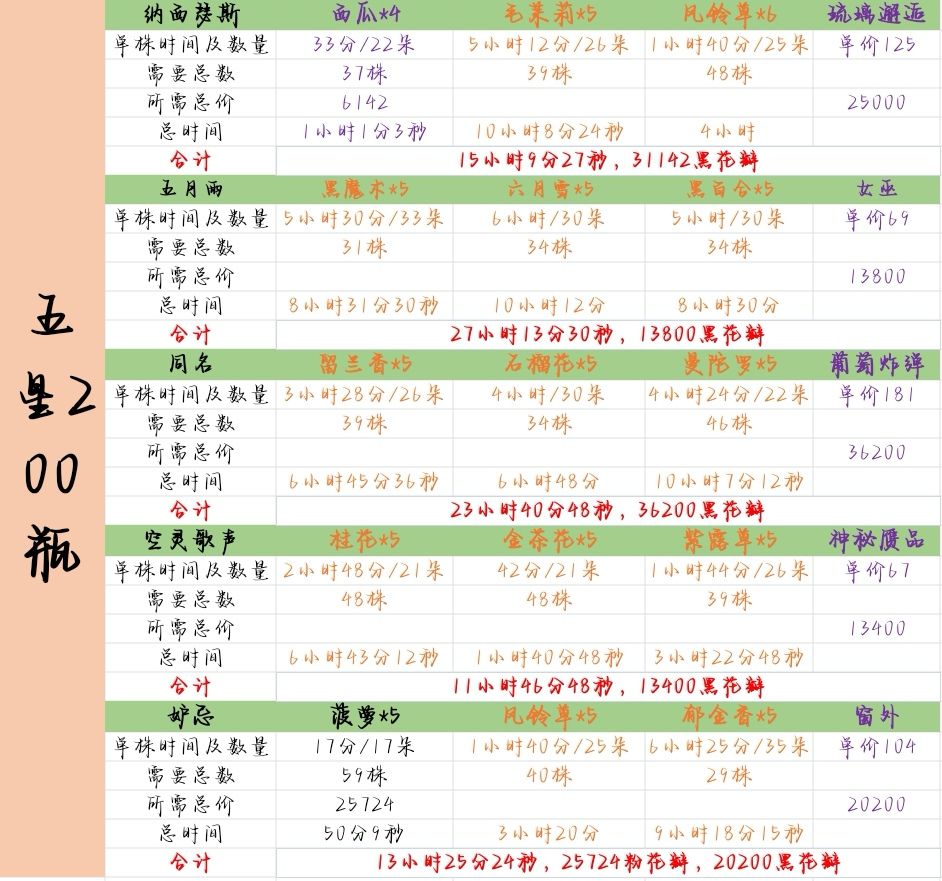1、单株所需时间及数量是假设无土地加成的数据,也就是一级都没有升级的情况下的。