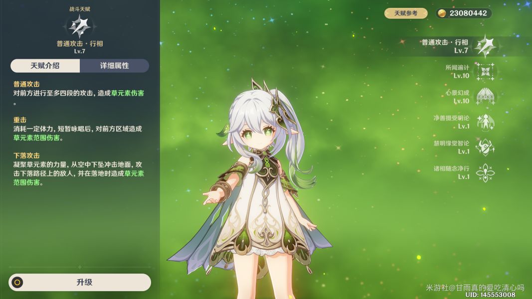 天赋,纳西妲的元素精通超过200的部分,每一点元素精通将提升灭净三业0.1%的伤害和0.03%的暴击率(纳西妲拥有1000精通时达到最大值),如果是释放元素爆发的前提下的话需要800左右的元素精通才能吃满天赋。