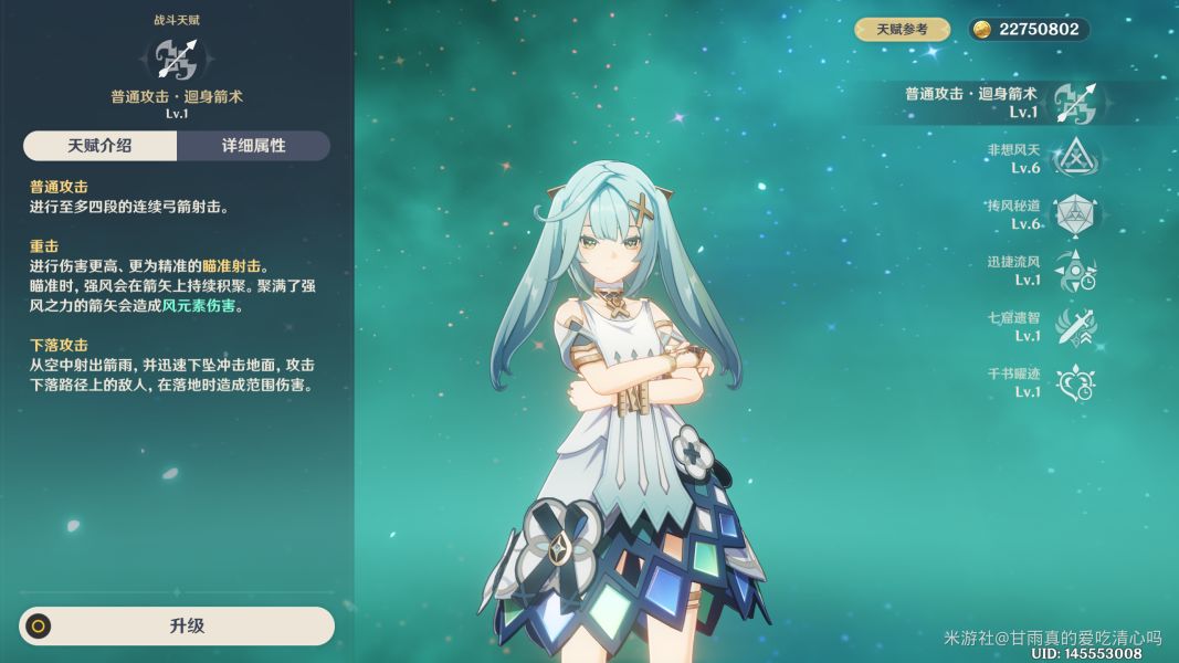 天赋,珐露珊释放过元素战技后,蓄力攻击所需时间减少60%,并且对风压坍陷命中的敌人施加诡风之祸的效果(降低敌人的风抗)