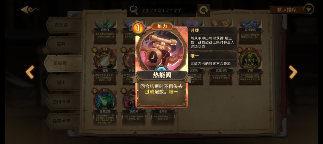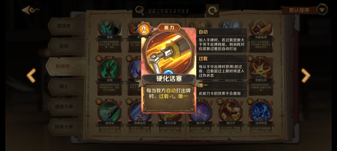 硬化活塞加热能阀:回合结束不失去过载,每次触发自动消耗过载后过载加一。(这俩可以保证无损打出一费自动,并且不会因为回合结束耗尽自动)