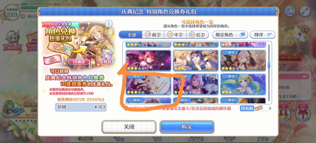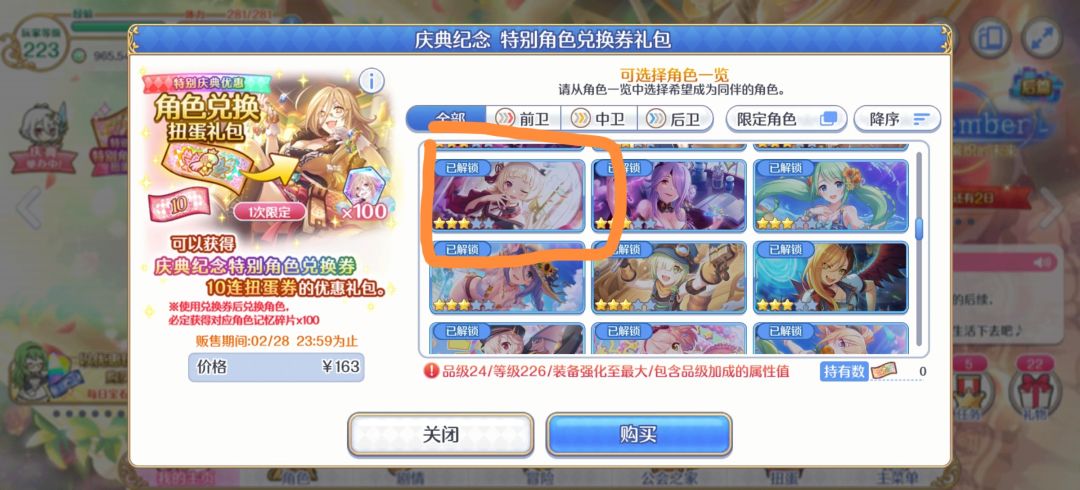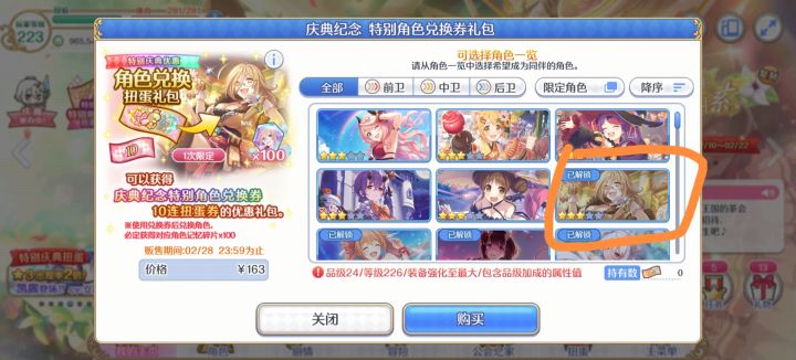 如果你玩这个游戏不算久并且愿意氪这个163来补充一下自己的强度的话希望以下的建议能帮到你,我圈起来的这几个应该都有很长时间的强度,类似于水望这种就没圈了,她似乎没那么久的强度了。像深月(大江户)这种也是竞技场的人权级,但我竞技场摆烂,所以也不作推荐。