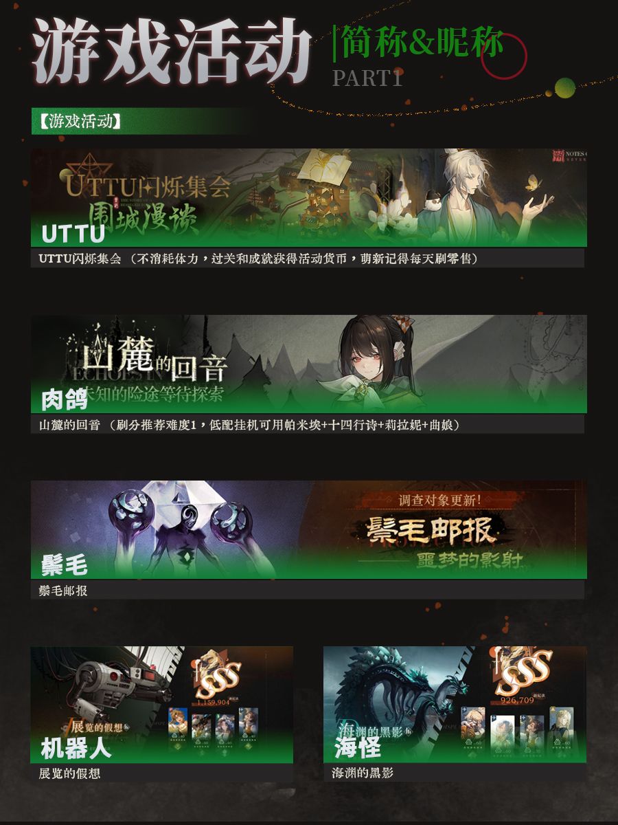 本文主要介绍【常用角色简称&昵称】【游戏道具】【活动简称】等内容。主要为了让萌新能看懂别人的帖子里的指代对象。