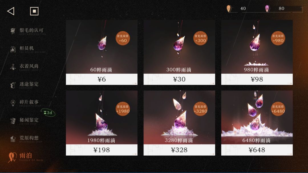 - 来源:氪金,月卡30R=300紫雨,首充30R=600紫雨