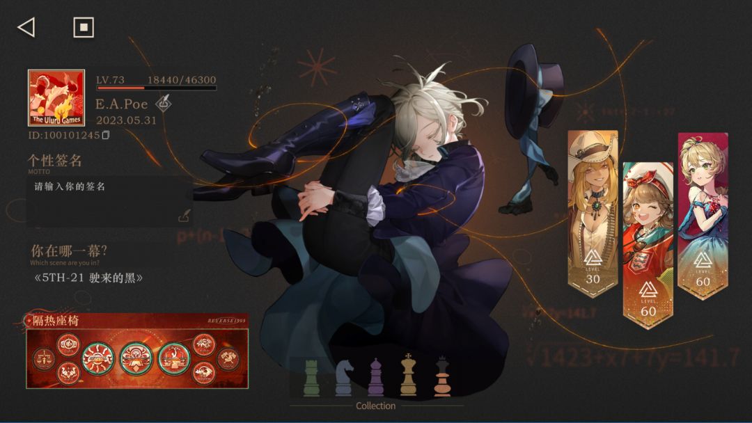 练度:角色14个洞悉III60级,4个洞悉III30级,17个洞悉II;心相全满,9个60级,5个满增幅6星心相;好感全满