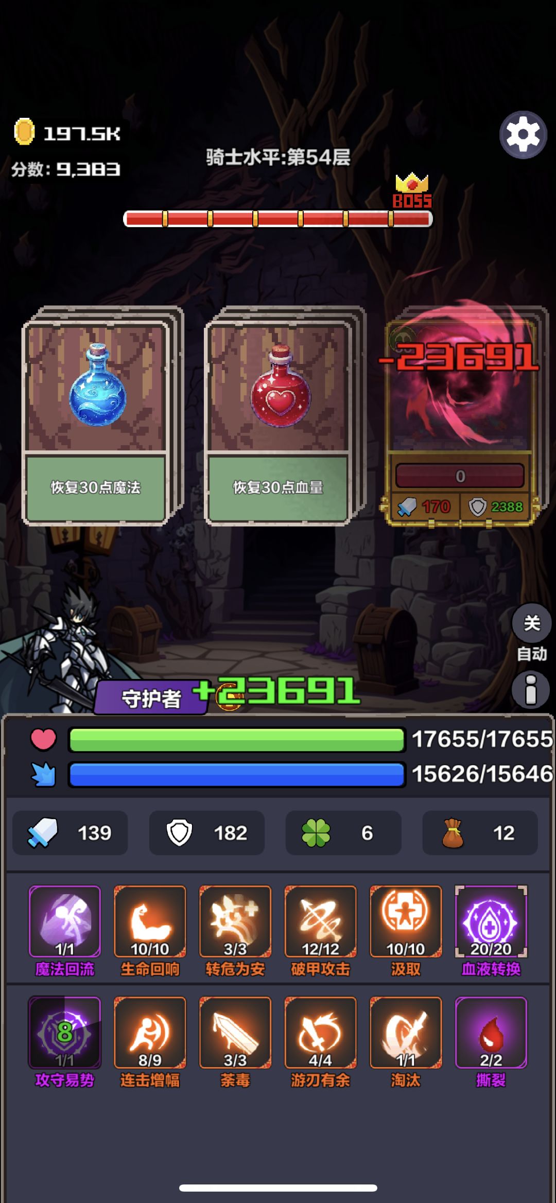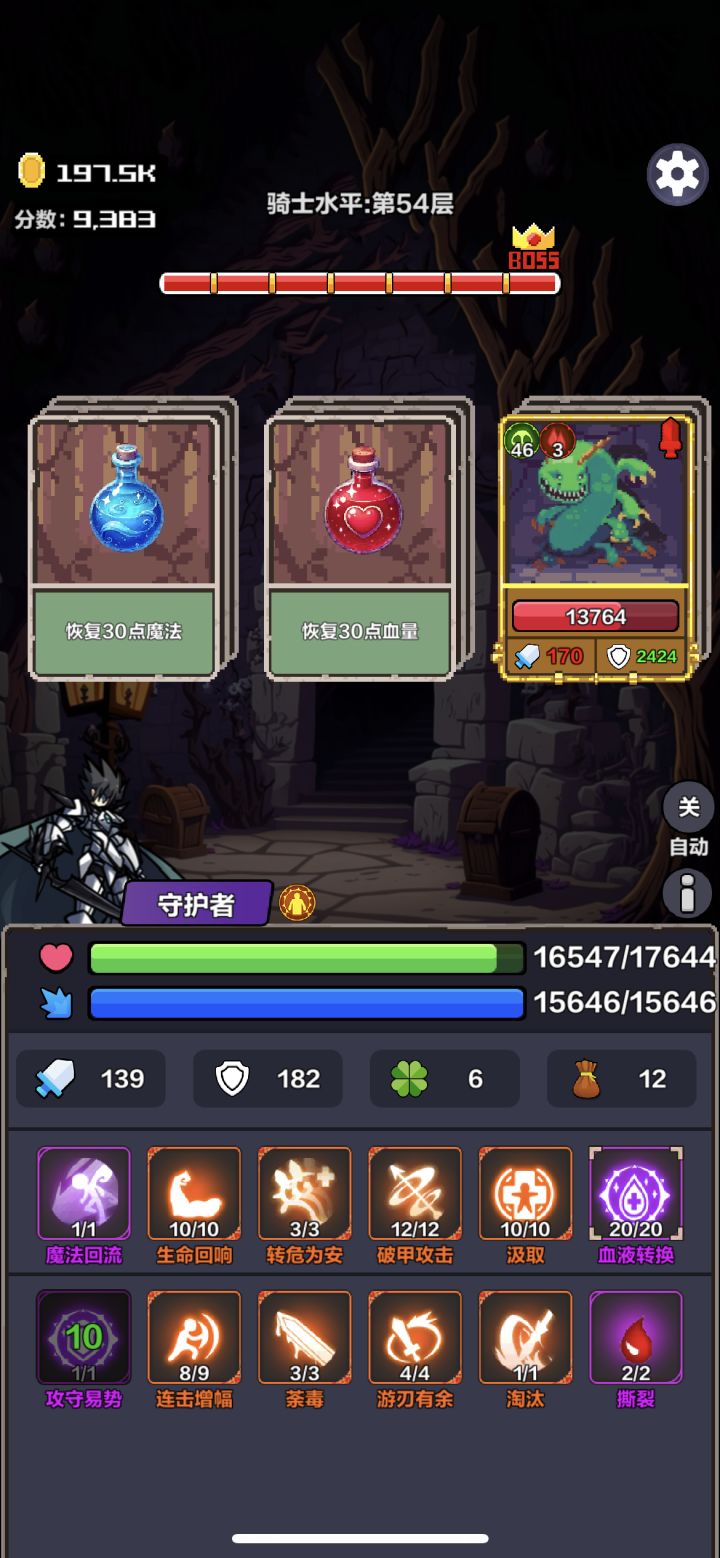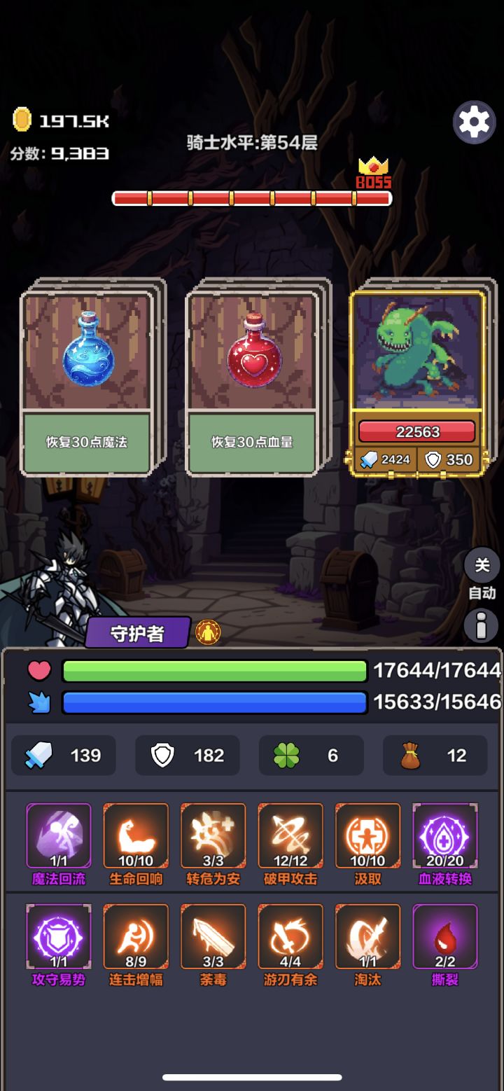 攻击2420防御350的boss ,先平A防御降低到182,释放攻守易势,算一回合所以boss攻击变成182-12=170