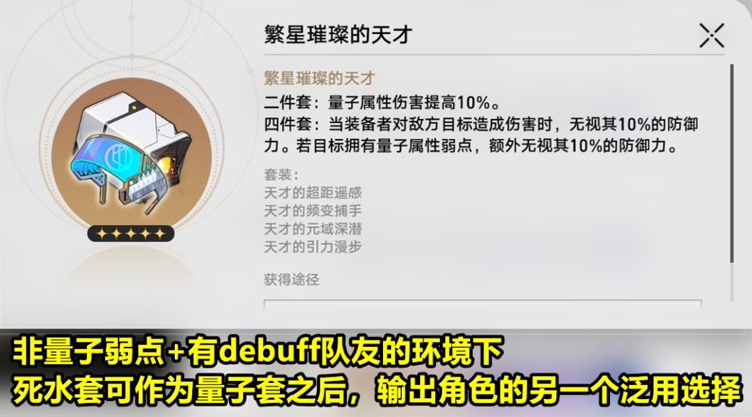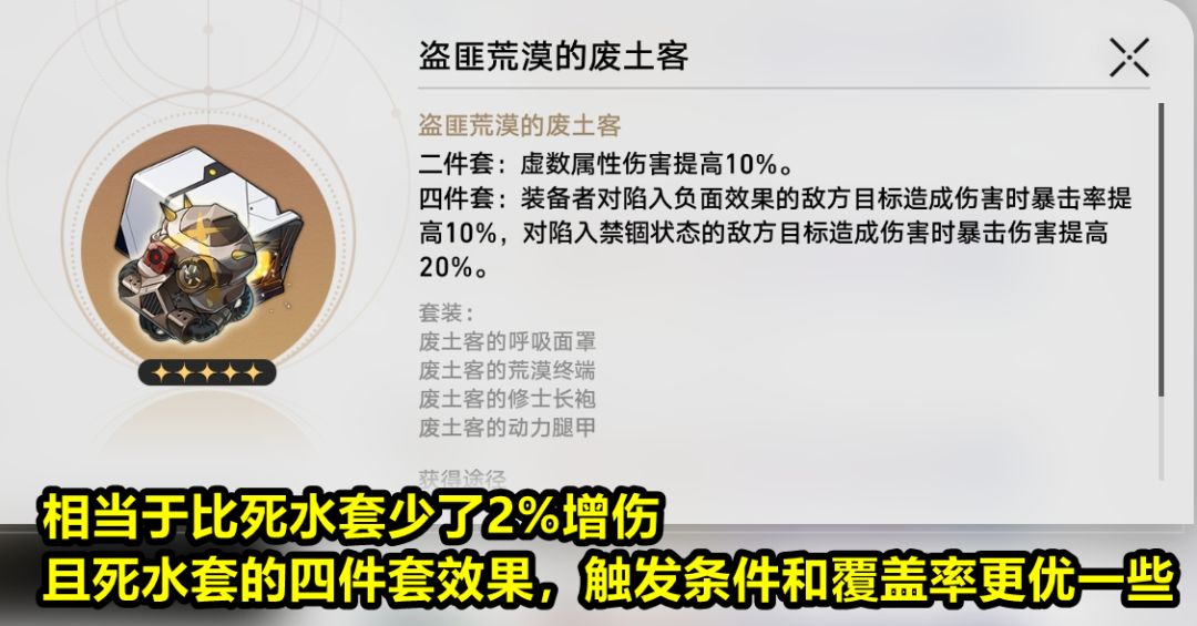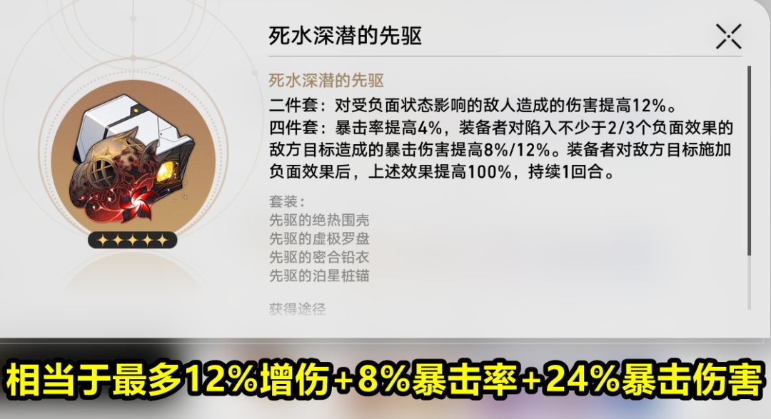 另外即使不触发最后的翻倍双暴,靠队友挂负面效果,输出装备死水套后,最多也有12%增伤+8%暴击率+16%暴伤,作为替代泛用套装这个加成已经相当不错了。当然前提是非量子弱点+有debuff队友的环境,否则还是量子套更为万金油。