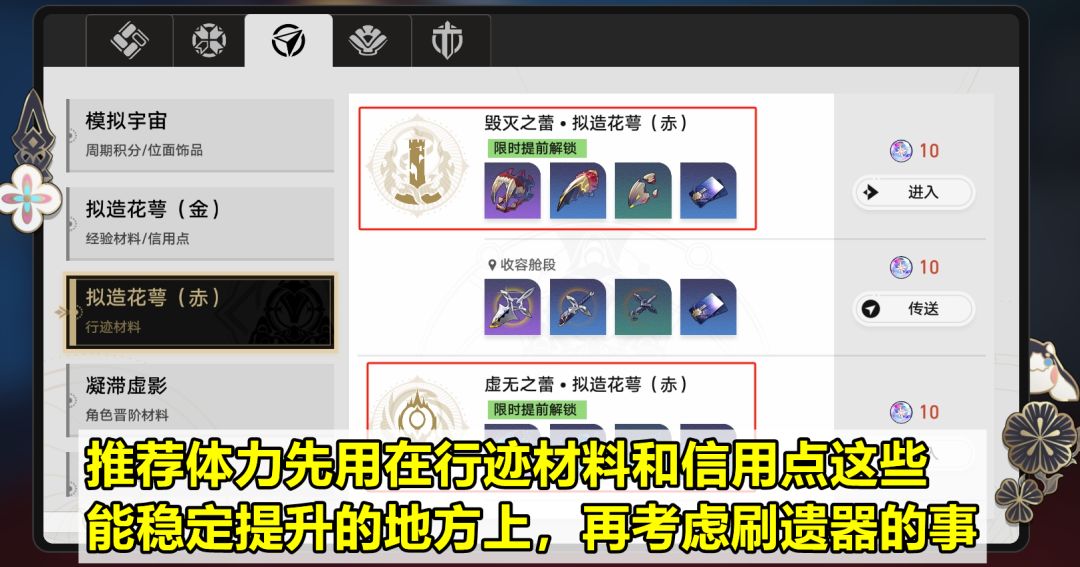 除了上述几种情况,一般个人更推荐刷的遗器本依然是输出泛用的量子本、辅助泛用的信使本还有用的角色比较多的追击/dot本这三个。另外2.0版本开启后,包括以后的新角色估计都会用到新的行迹材料需要重新刷,还有经常会缺的信用点和经验书等等。理应先将体力用在这些能稳定提升的地方,遗器先用过渡的,最后才考虑刷成型套装~