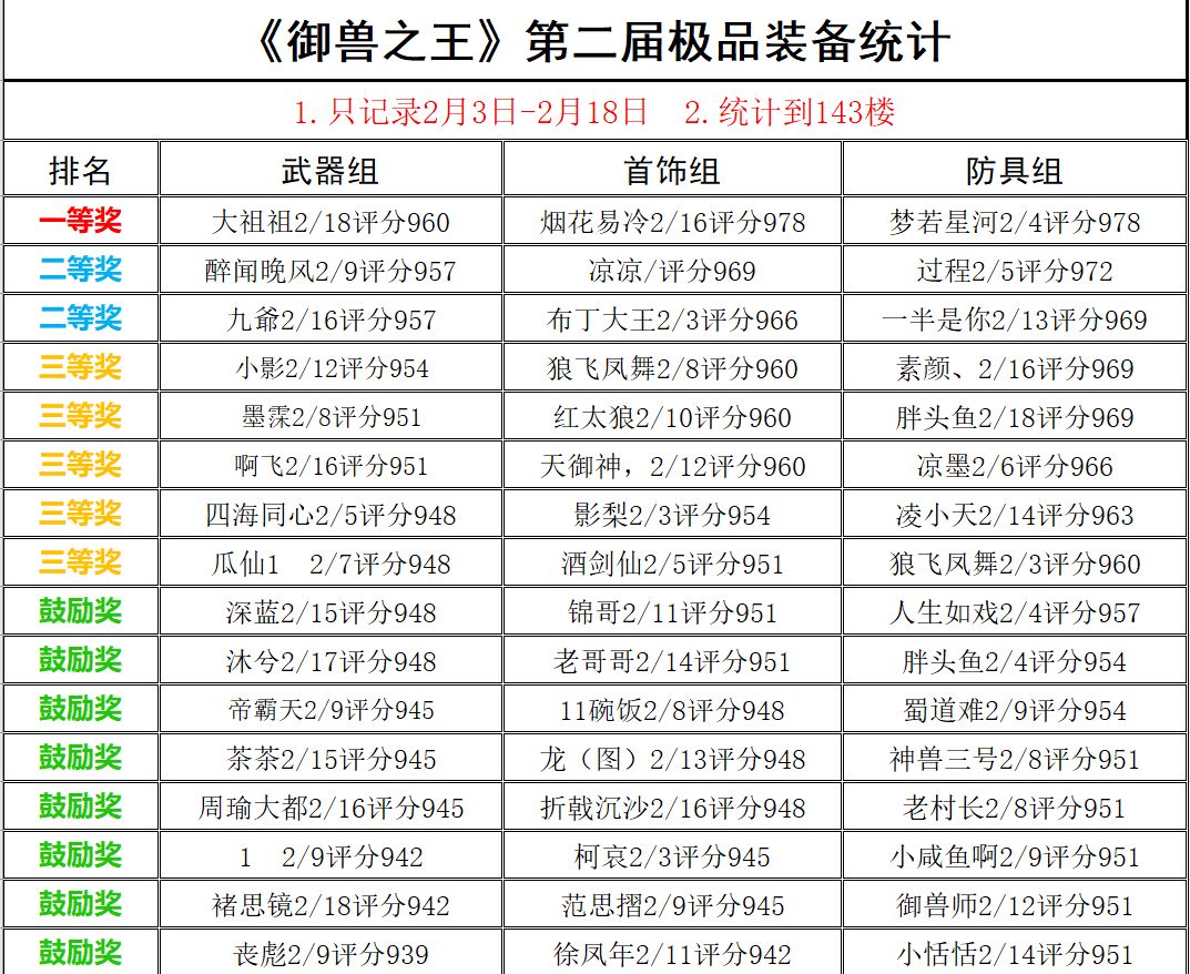 《御兽之王》第二届欧皇大赛获奖名单