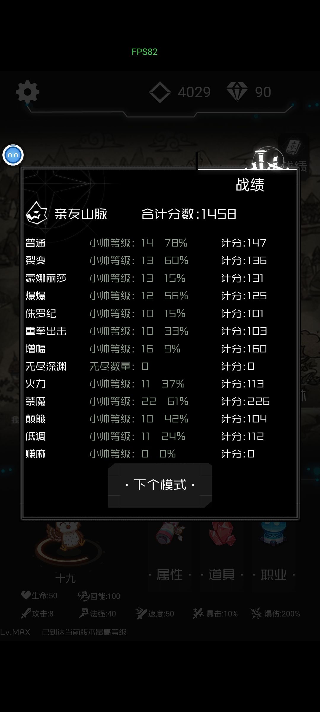 第一个是好友模式的禁魔,因为禁魔每次释放技能可以增加属性,那么选择技能主要思路就是能量回复手段,在本模式下,每秒能量回复是无效的(泪滴道具有效),所以要选择其它回能手段,目标为达成满蓝无限技能。选择2条蛇,属性建议生命>攻速>强度>攻击,技能所需能量为600,技能血的代价-150,绷带-40,此时技能所需能量为410,感冒药为每次释放技能回复6%能量,能量最大值为6834,就可以达成每次释放技能回复的能量超过410,最终得出技能选择思路为:开局吃好喝好,技能选择打针+绷带(满级后使用道具超级防御+1000能量最大值)+血的代价,必选限制解除,暴击技能优先:中+同归于尽+精准+暴揍+成长,输出技能:能量冲击+超级飞剑+多重施法,备选骷髅王,时间恶魔,弃剑从拳,双股剑,魔法轰炸;增伤技能首选暴躁一击,扫描,能量冲击,企鹅骑士;其他技能:法术精通+阴阳+龙族血脉;生存:有了道具超级防御死不了,不考虑生存。
