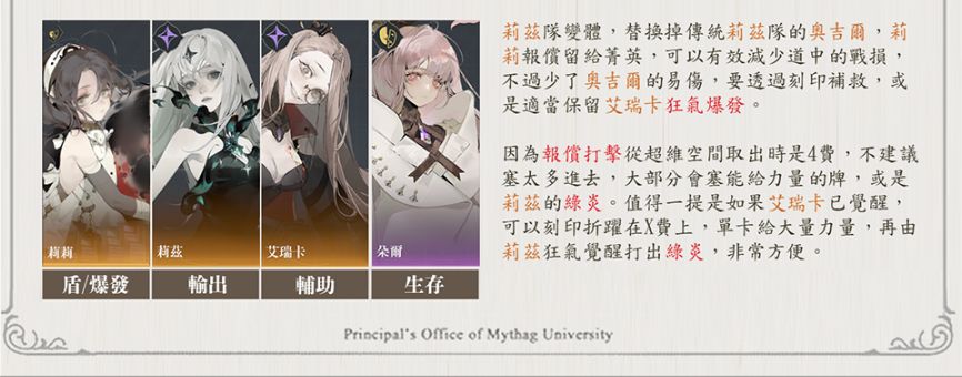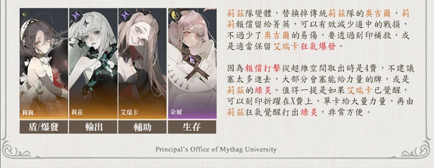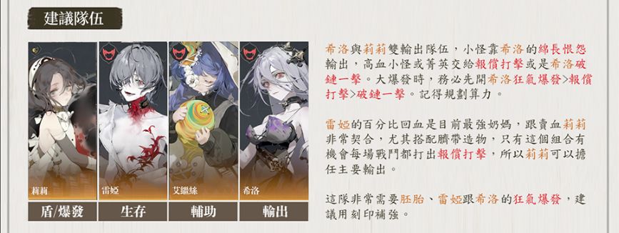 希洛与莉莉双输出队伍,小怪靠希洛的绵长恨怨输出,高血小怪或菁英交给报偿打击或是希洛破链一击。大爆发时,务必先开希洛狂气爆发>报偿打击>破链一击。记得规划算力。