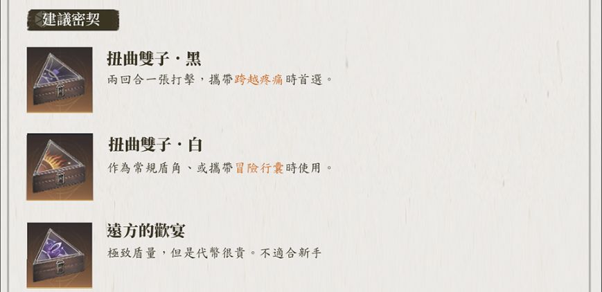 扭曲双子·黑:两回合一张打击,携带跨越疼痛时首选。扭曲双子·白:作为常规盾角、或携带冒险行囊时使用。远方的欢宴:极致盾量,但是代币很贵。不适合新手。