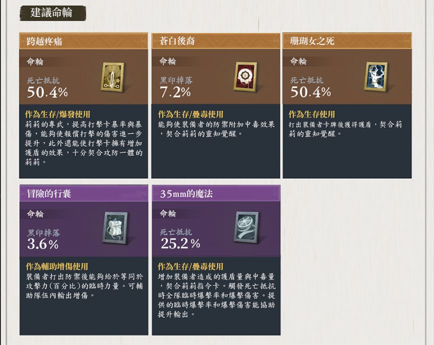 跨越疼痛:作为生存/爆发使用。莉莉的专武,提高打击卡暴率舆暴伤,能够使报偿打击的伤害进一步提升,此外还能使打击卡拥有增加护盾的效果,十分契合攻防一体的莉莉。