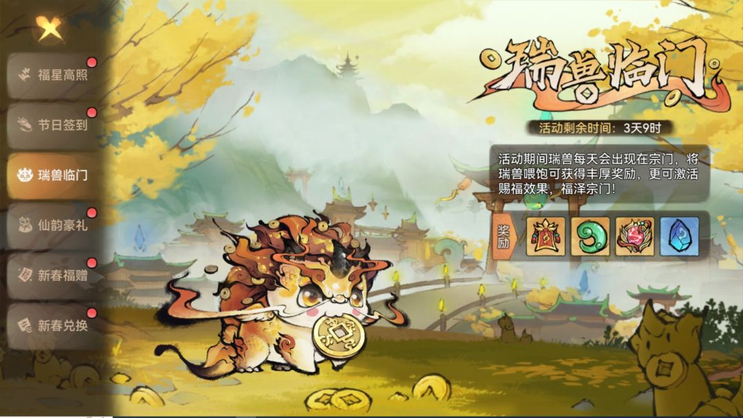 在活动期间,每日都会有可爱的瑞兽悠然降临宗门之中。只需悉心喂养这些瑞兽,便能收获丰厚的奖励。不仅有珍贵的灵玉、寻仙令等宝物,更有大量声望值助祖师提升宗门等级。此外,还会激活赐福效果,让整个宗门共同沐浴在福泽之中!
