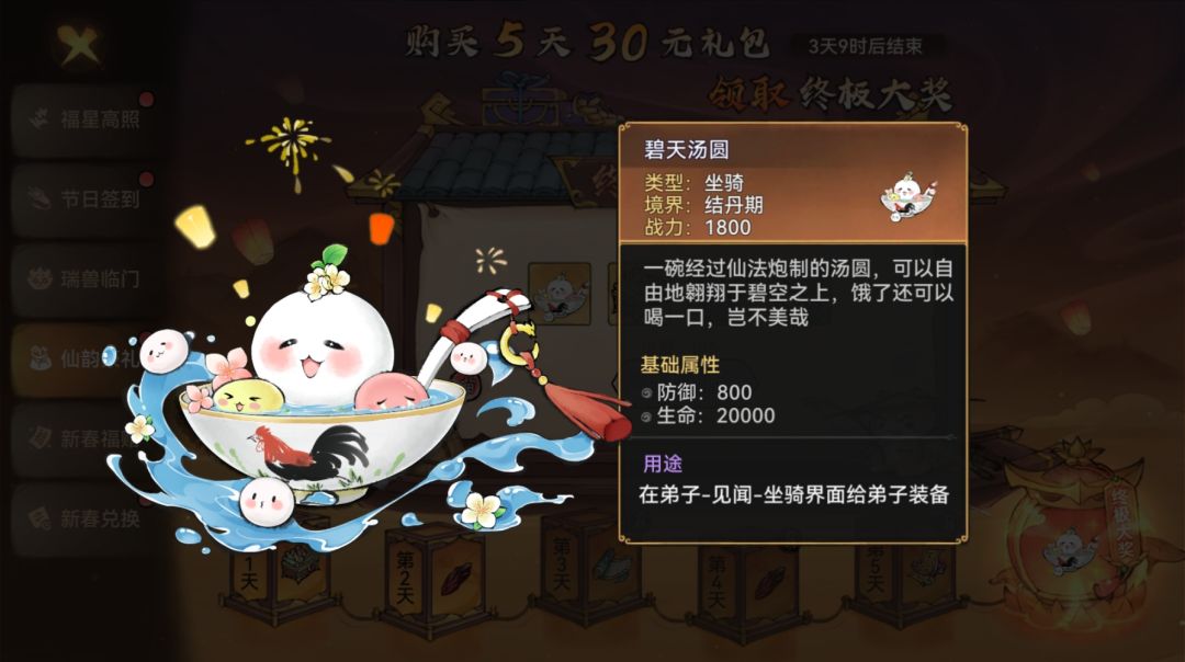 活动期间累计充值5日,将获得终极大奖碧天汤圆坐骑以及珍贵的天道传书等奖励。这款可爱的汤圆坐骑设计独特,萌态可掬,软软甜甜的看得小清瑶都流口水了。