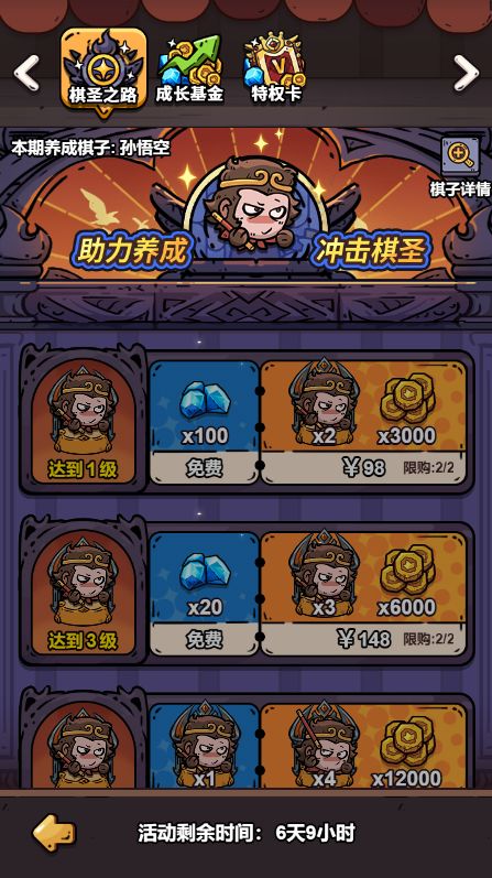 弈士们将棋子【孙悟空】培养至一定等级,即可免费领取包括棋子本体在内的多种奖励;也可以根据个人需求解锁助力礼包,助力棋子养成!