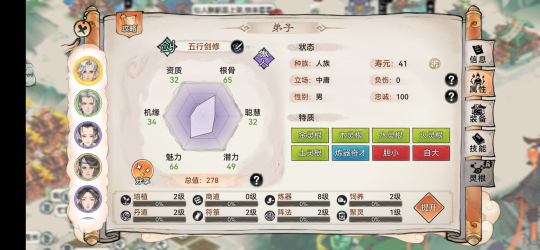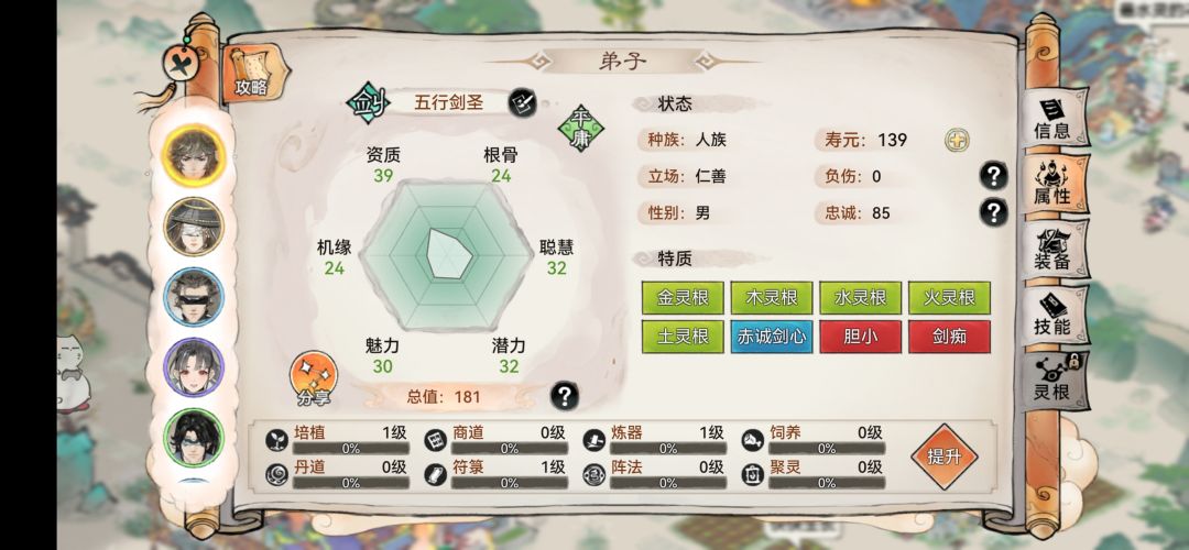 普通五行剑 五行灵根+潜力70左右+1-2个特质怪癖