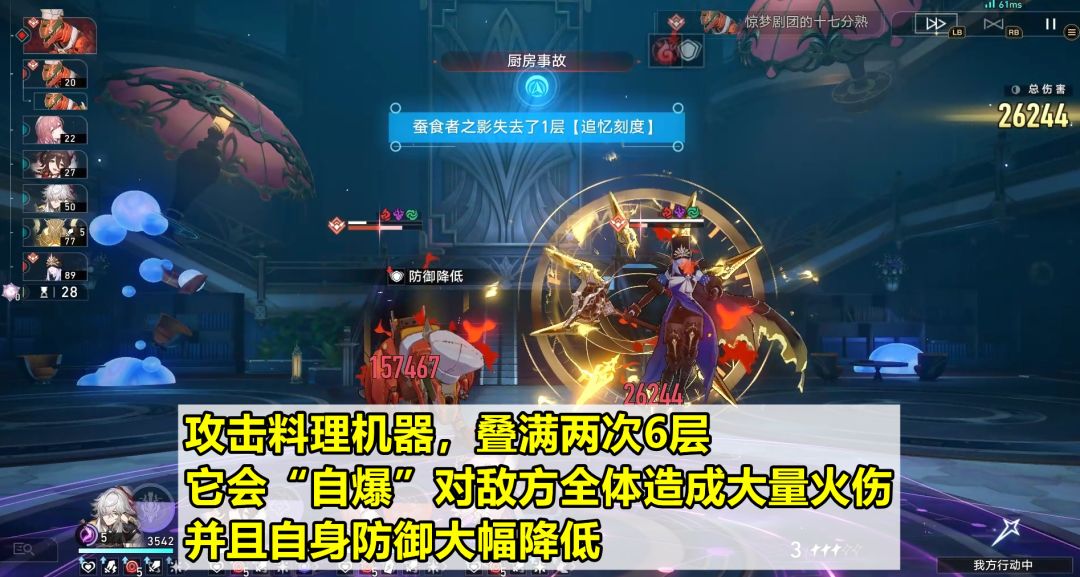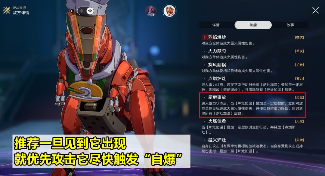 惊梦剧团的十七分熟:简称“料理机器”。一旦出现的话,推荐优先攻击它,因为它有个受到攻击后叠层的机制:第一次叠满6层会进入点燃状态;在它下一次行动前,再叠满6层会“自爆”,对敌方全体造成大量火伤,并且它自身防御力大幅降低。